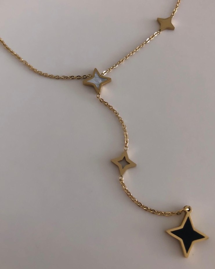 Zincir detaylı, yıldız şeklinde süslemelere sahip uzun altın renkli kolye, günlük kullanıma uygun minimal ve parlak tasarım sunar. ✨ Çelik✨