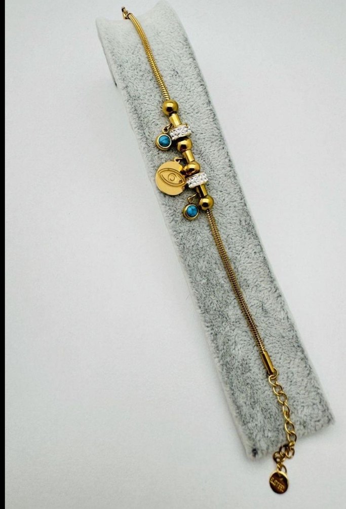 Altın renkli, zincir detaylı ve renkli boncuklu, yılan desenli bohem ve minimalist tarzda günlük kullanıma uygun bileklik.