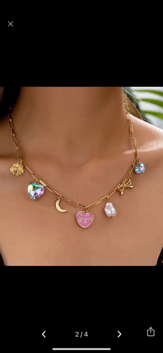Pastel renkli işleme detaylı, kalp, ay ve inci figürlü altın renk zincir kolye. Romantik buluşmalar için bohem tarzda şık bir seçim.