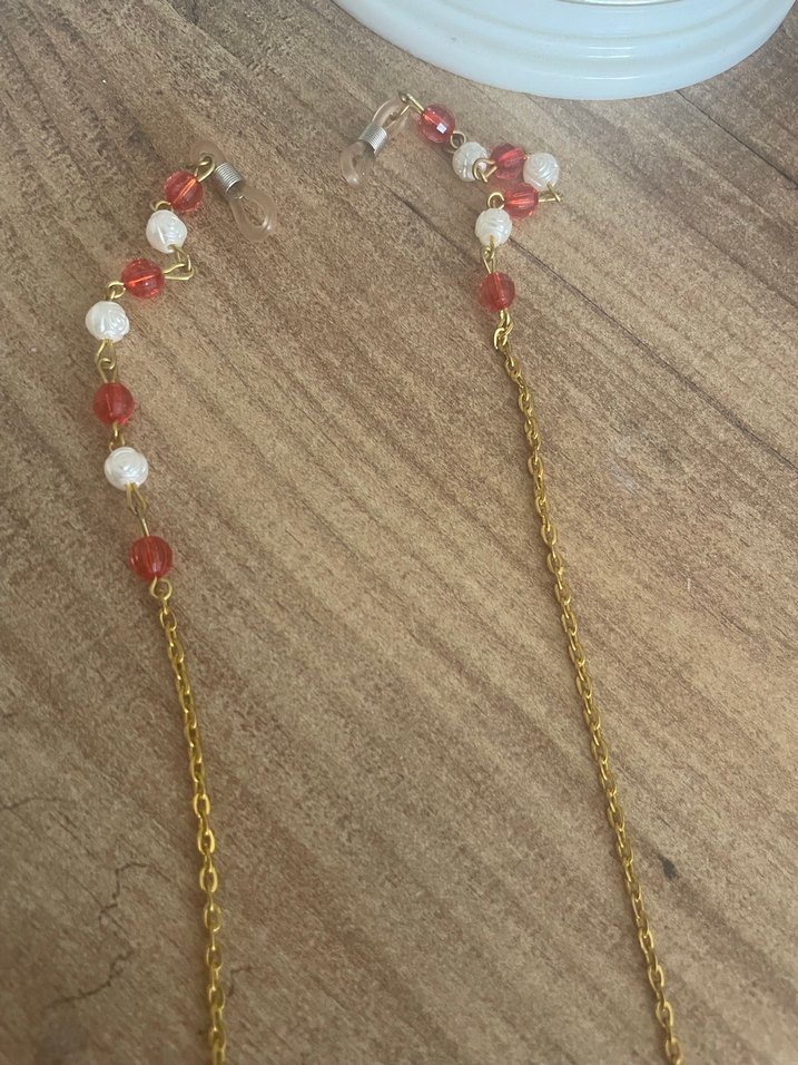 Altın renkli kadın kulak manşeti, zincir detayları ve kırmızı-beyaz işleme boncuklarla bohem tarzı yansıtıyor. Gözlük askısı çok az zincirinde kararma var