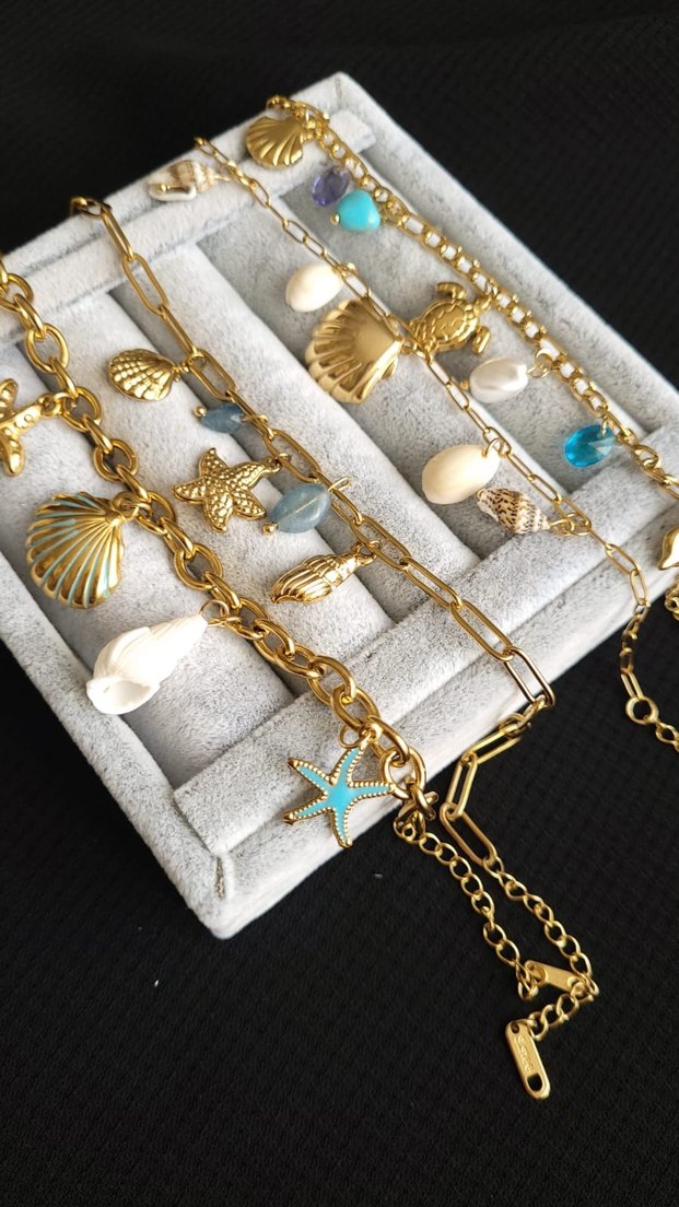 Deniz kabuğu ve denizyıldızı figürlü, zincir detaylı altın renk bohem Bileklik günlük kullanıma uygun.