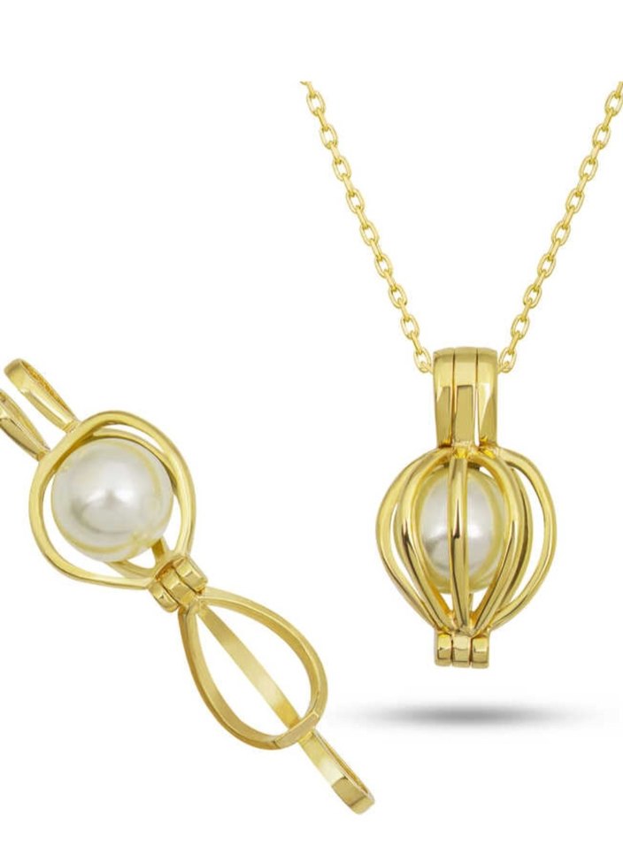 Altın renkli, zincir detaylı kolye, inciyi modern klasik kafes tasarımında sunar. Düğün ve şık etkinlikler için uygundur.