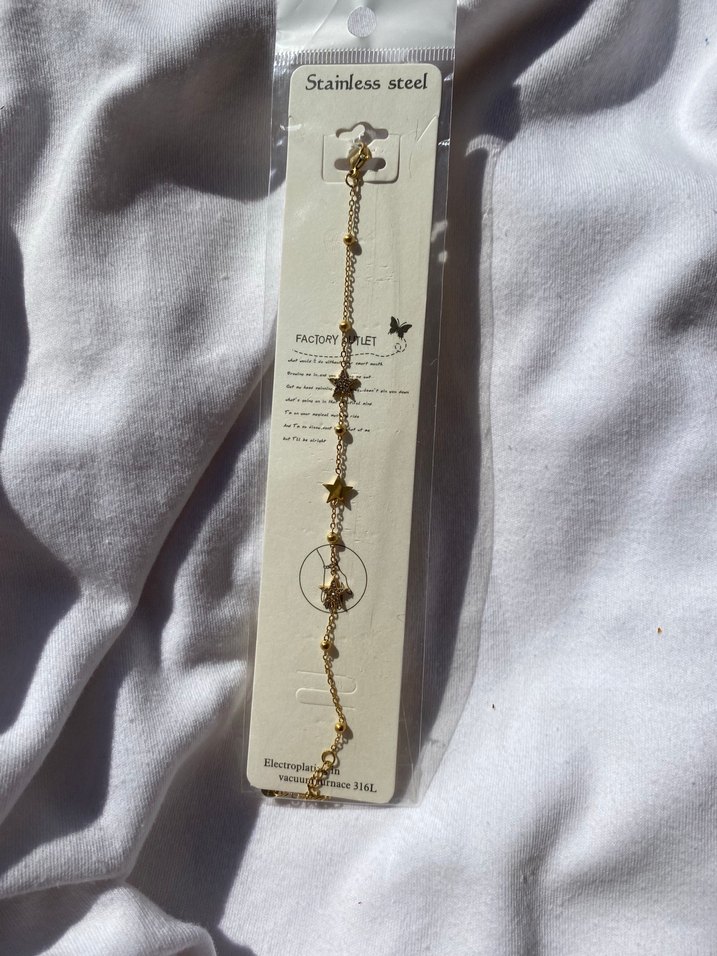 Zincir detaylı, işlemeli yıldız desenli altın renk kadın bileklik. Paslanmaz çelikten, parlak yüzeyli, günlük kullanım için uygun.