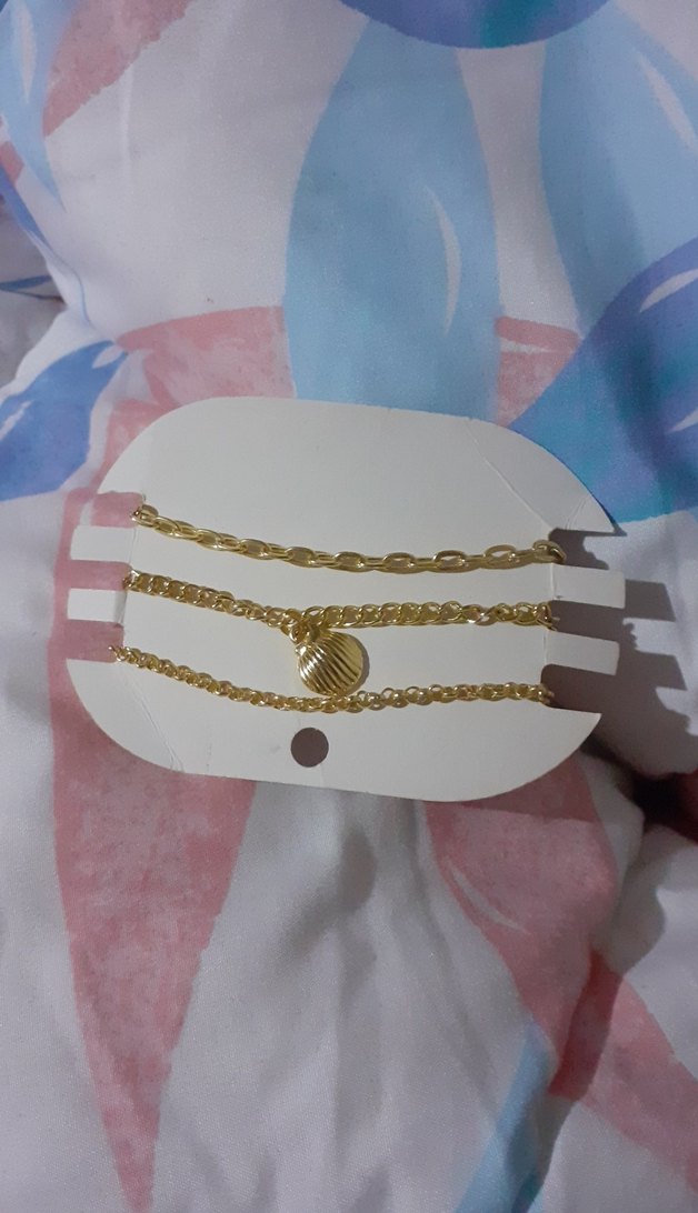 Altın renkli, zincir detaylı ve deniz kabuğu şeklinde bir charm içeren minimalist bohem tarzda kadın bileklik.