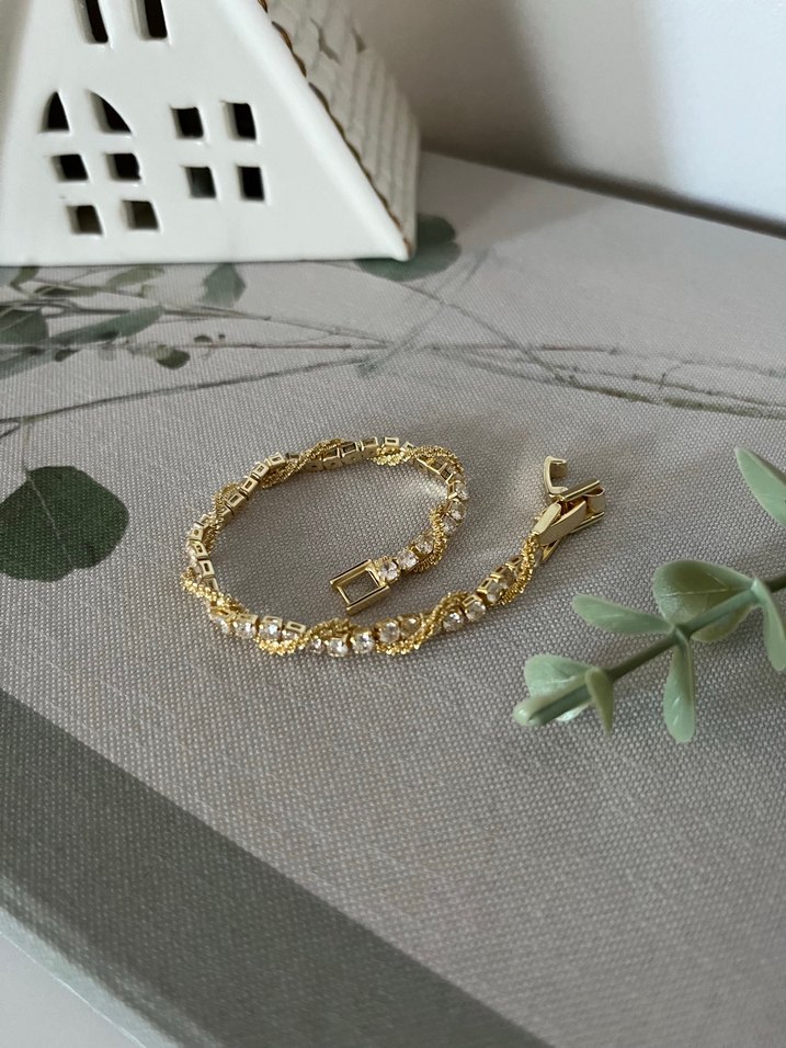 Altın renginde, zincir detaylı ve yılan desenli kadın bileklik. Modern klasik tarzı yansıtır, düğün ve özel günler için uygundur.