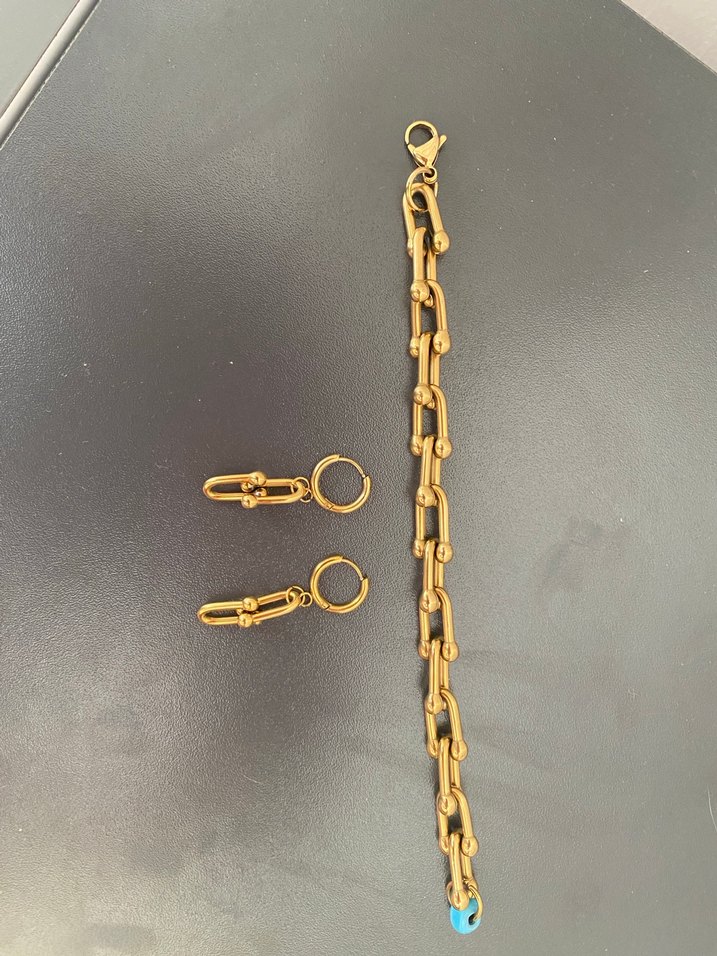 Zincir detaylı, parlak altın renkli kadın bileklik. Minimalist tarzda, günlük kullanım için uygun. Uyumu tamamlayan küpelerle birlikte. Boncugu ben takmistim istmezseniz cikarabilirsiniz. Celiktir kararma solma yapmaz asla.