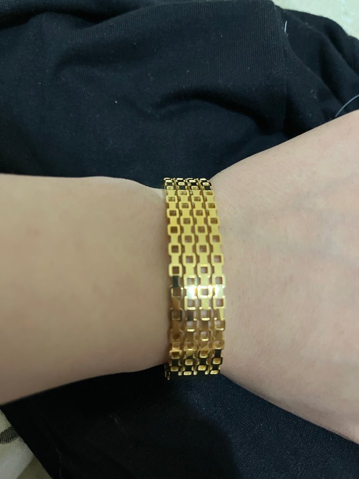 Parlak altın renkli, zincir detaylı kadın bileklik, minimalist sokak stili için günlük kullanıma uygun. ✨Çeliktir