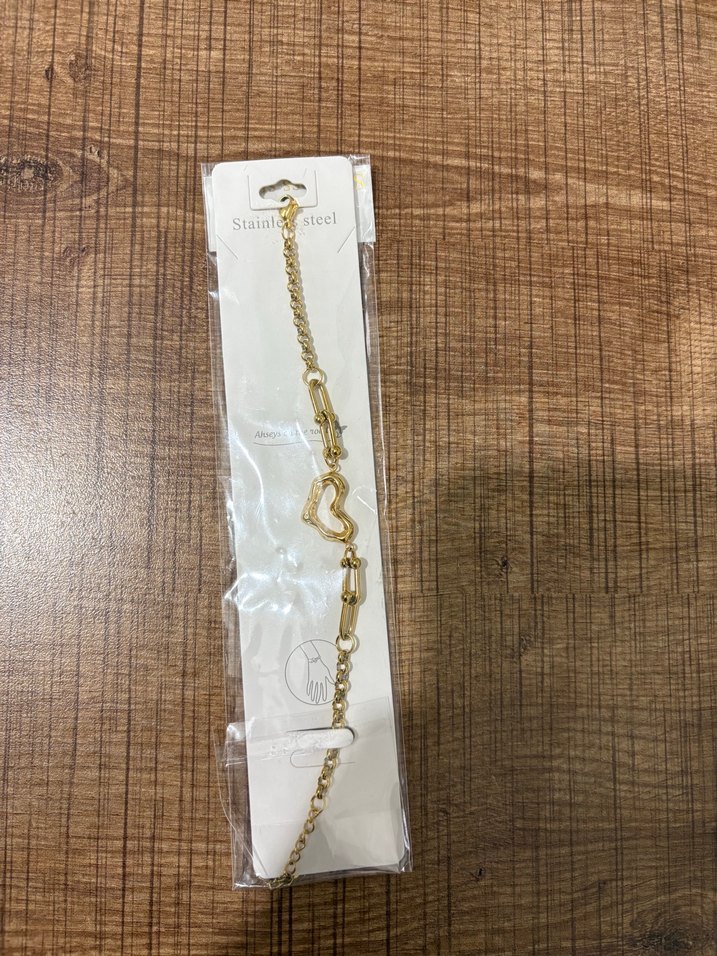 Altın renkli, zincir detaylı kadın bilekliği, kalp figürlü şık bir tasarıma sahiptir. Parlak yüzeyi ve sade bohem tarzıyla günlük kullanıma uygundur. ✨