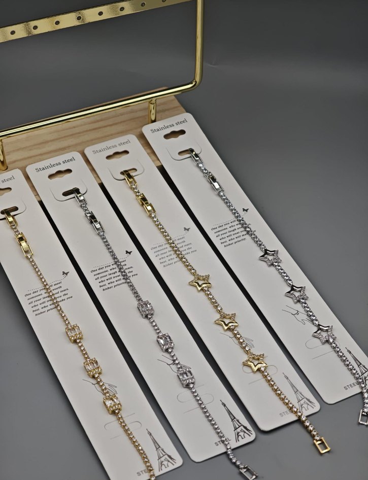 Paslanmaz çelikten, zincir detaylı ve işlemeli yıldız desenli altın renk bileklikler. Günlük kullanıma uygun, klasik Paris tarzında. ✨