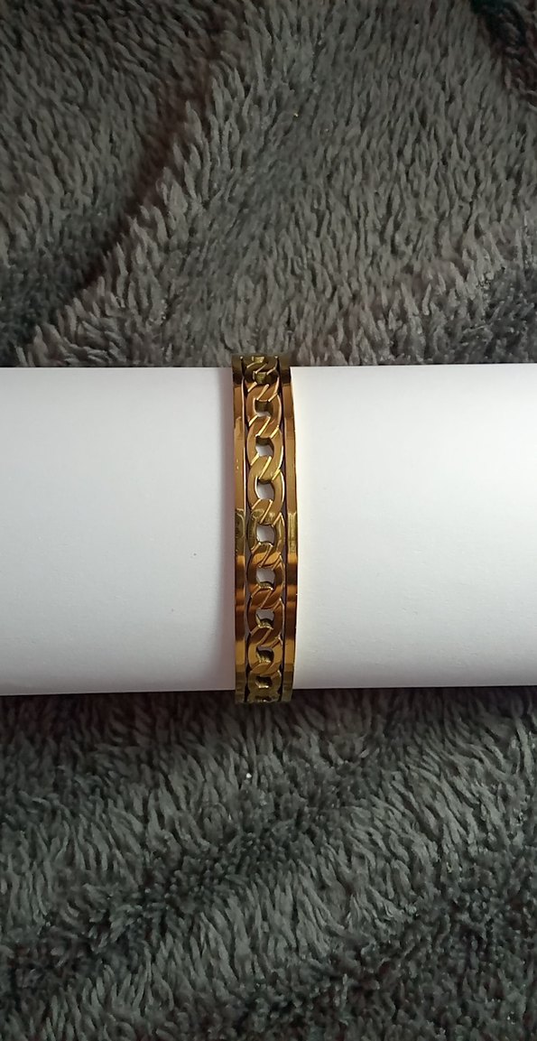 Zincir detaylı, parlak altın renkli kadın bileklik, yılan desenli ve düğünler için uygun.