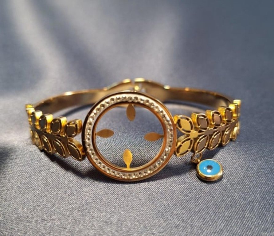 Altın renkli kadın bilekliği, zincir detaylı ve işlemeli desenli, parlak yüzeye sahip, günlük kullanıma uygun bohem stilde bir tasarımdır. ✨