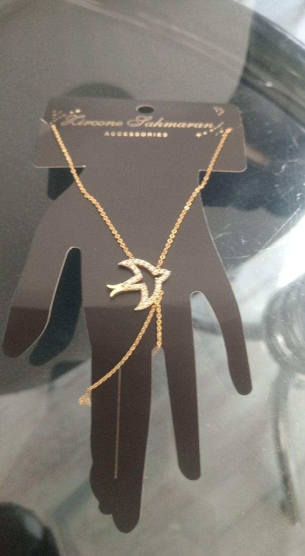 Parlak altın renkli, zincir detaylı ve kuş figürlü bohem tarzda kadın el zinciri, günlük kullanıma uygundur. ✨