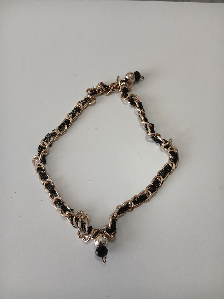 Zincir detaylı, koyu yılan desenli altın renk kadın el zinciri. Bohem tarzıyla günlük kullanıma uygun bir aksesuardır.