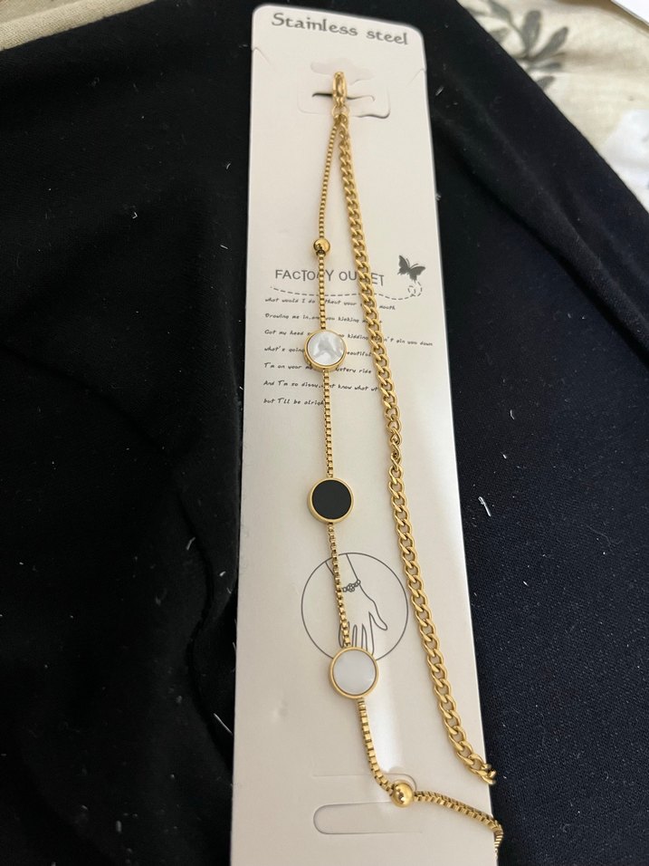 Altın renk paslanmaz çelikten, zincir detaylı ve siyah-beyaz taşlı kadın el zinciri. Minimalist tarzda, günlük kullanım için uygun. ✨