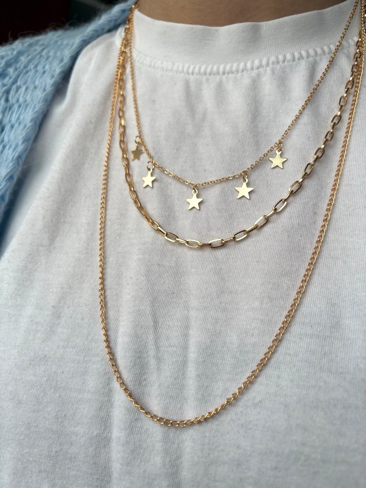 Zincir detaylı, yıldız figürlü altın renkli kolyeler, günlük kullanıma uygun. Midi uzunlukta, parlak ve minimal nakış desenlidir, şık sokak stili için ideal. ✨