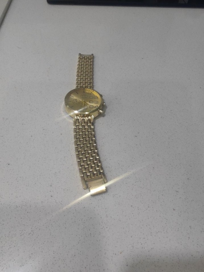 Parlak altın renkli, zincir detaylı kadın saati, sade ve eski tarz sokak modunu yansıtıyor. ⌚