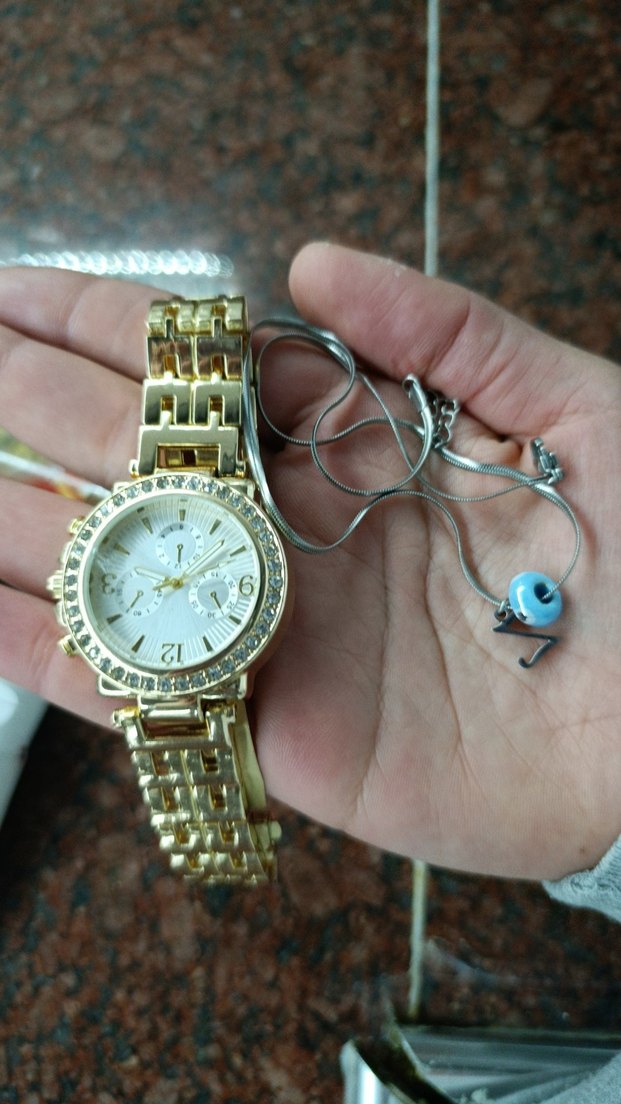 Zincir detaylı, beyaz kadranlı ve çoklu alt kadranlara sahip altın renk kadın saati. Trendy bir görünüme sahiptir. ⌚