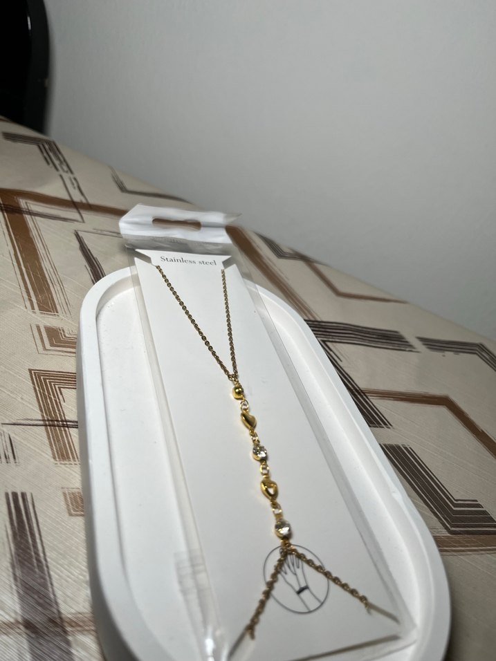 Minimalist bohem tarzda, zincir detaylı ve baskılı desenli altın renk kadın el zinciri, günlük kullanım için klasik şıklık sunar. ✨