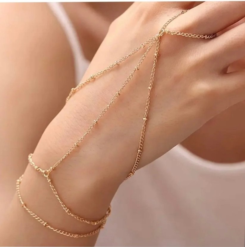 Zincir detaylı, altın renkli kadın el şahmeran. Bohem tarzıyla günlük kullanıma uygun, hafif ve göz alıcı tasarım. ✨
