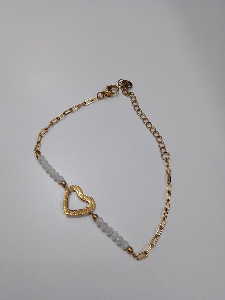 Altın renkli zincir detaylı bileklik, kalp figürü ve küçük beyaz boncuklar ile bohem ve minimal bir tarz sunar.