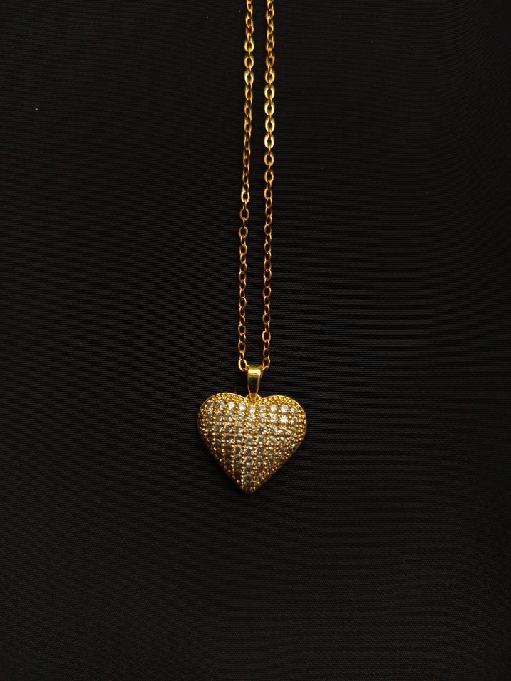 Altın renkli, zincir detaylı ve renkli taşlarla süslenmiş kalp şeklinde midi uzunluğunda kolye. Ürün çeliktir.