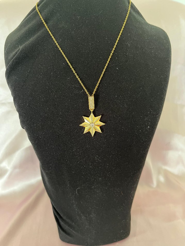 Zincir detaylı ve parlak altın renkli, yıldız şeklinde uçlu midi uzunlukta klasik ve gösterişli günlük kullanıma uygun kolye. ✨