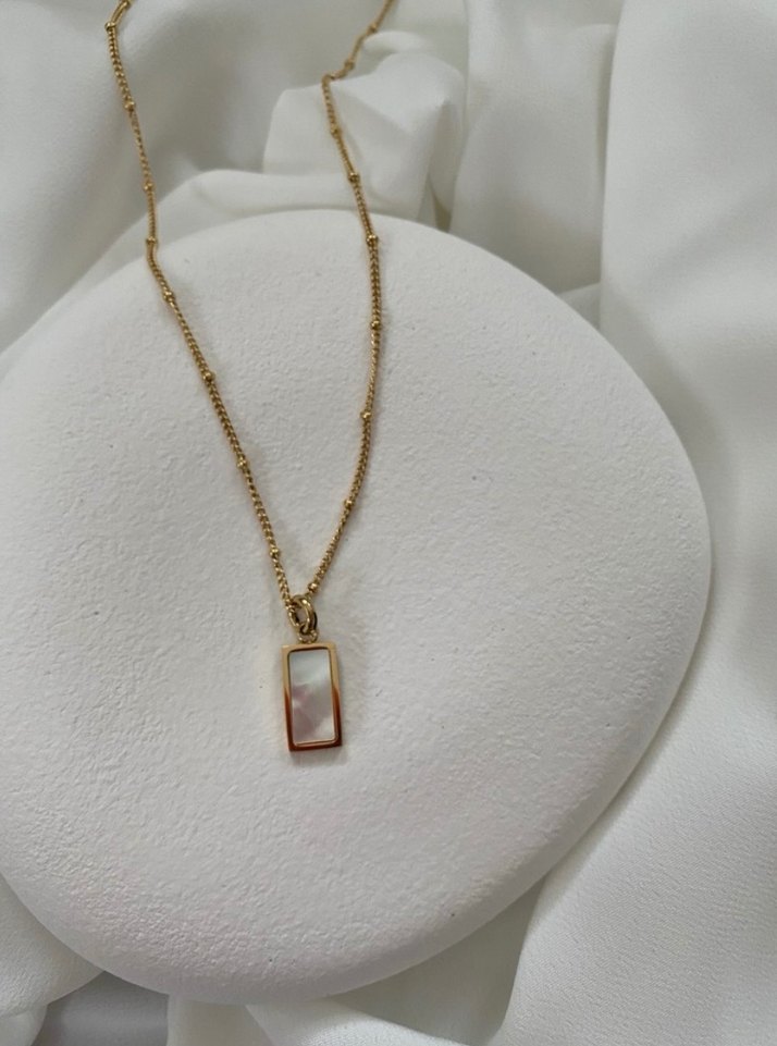 Altın renkli, zincir detaylı ve dikdörtgen bir kolyeden oluşan midi uzunlukta sade tasarım. Günlük kullanım ve klasik zarafet için uygundur. ✨