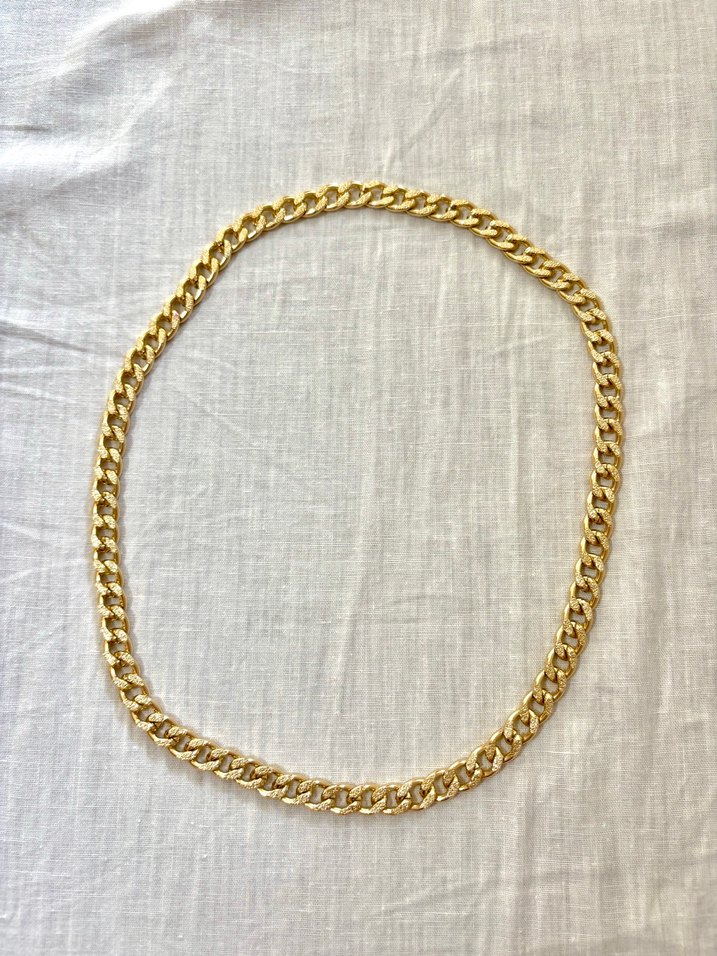 Altın renkli, zincir detaylı ve parlak yüzeyli midi uzunlukta kolye. Minimalist ve bohem tarzda, günlük kullanıma uygun.