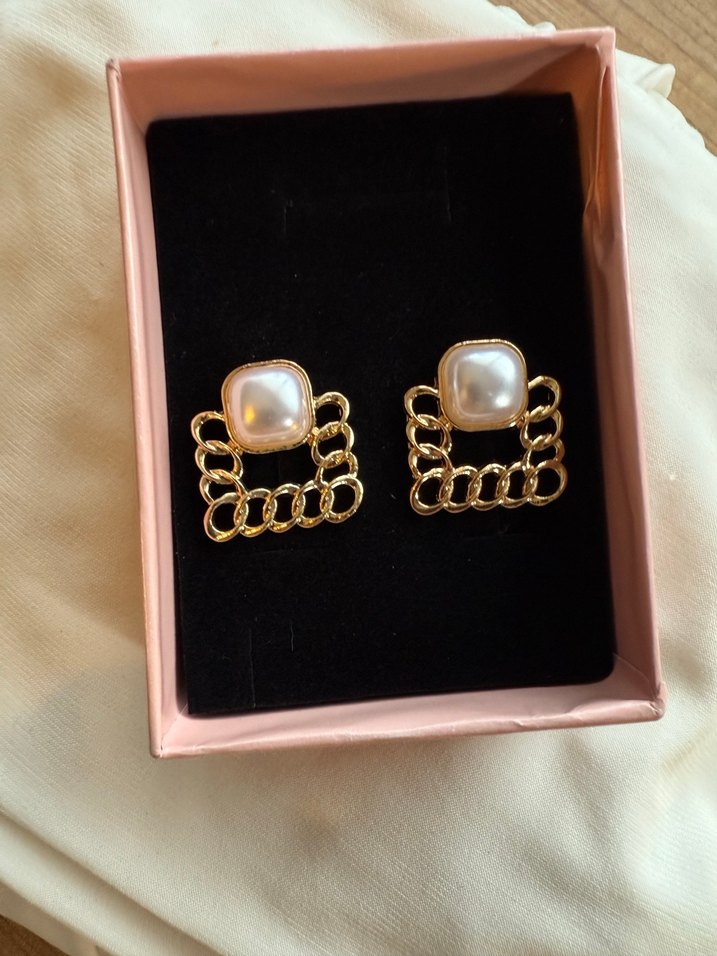 Altın renkli zincir detaylı mini küpeler, inci ve kare desenli tasarımıyla modern klasik tarzı yansıtıyor. Parlak yüzeyi romantik akşamlar için uygun.