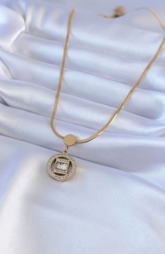 Zincir detaylı, altın renkli kısa kolye. Yılan deseni içeren yuvarlak bir kolye ucu bulunur. Minimalist ve klasik şıklık için uygundur. ✨