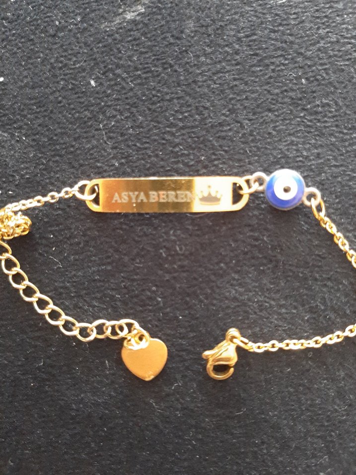 Zincir detaylı, altın renkli kız çocuğu bilekliği. Üzerinde "ASYA BEREN" yazısı ve koyu renkli nazar boncuğu deseni bulunur. Paslanmaz çelik olup kararmaz solmaz Günlük kullanıma uygun, sade tasarım. ✨