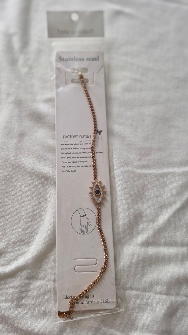 Parlak altın renkli zincir detaylı bileklik, paslanmaz çelik ve göz desenli baskıya sahip. Günlük sokak stiline uygun minimal tasarım. ✨