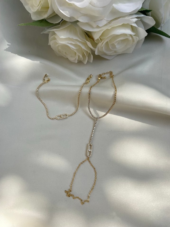 Altın renk zincir detaylı el zinciri, hafif yılan deseniyle. Günlük kullanıma uygun minimalist ve çağdaş tasarım. İKİSİ AYRI SATILIYOR FOTOĞRARFTA KOMBİN YAPILMIŞTIR