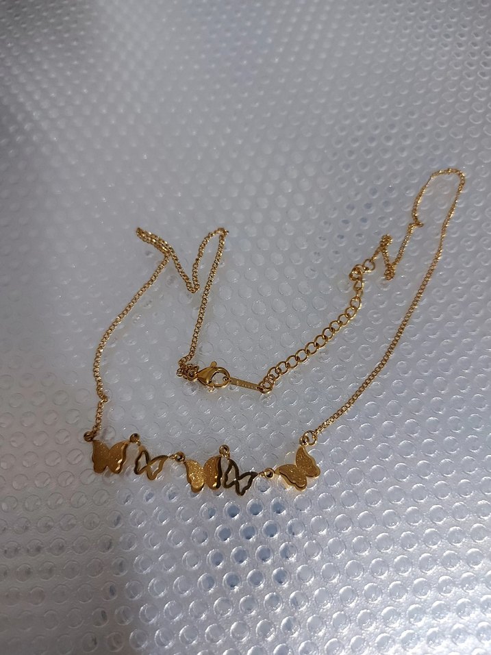 Altın renkli, zincir detaylı, işlemeli kelebek desenli minimal kolye. Midi uzunlukta, günlük sokak stiline uygun parlak tasarım. Çeliktir, 2 kere ancak takılmistir