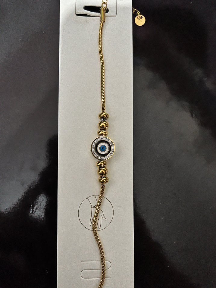 Altın renkli, zincir detaylı bileklikte ortada nazar boncuğu bulunur; çağdaş ve minimal bohem tarzı yansıtır.