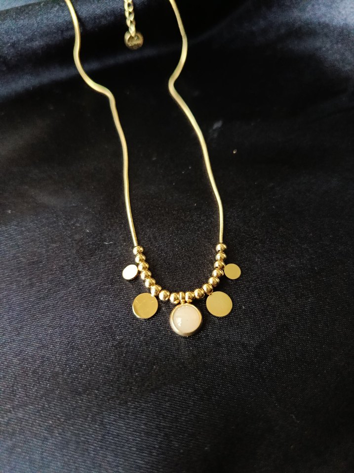 Uzun zincir detaylı, altın renkli ve puantiyeli kolye, minimalist ve çağdaş tasarıma sahip günlük kullanıma uygun. ✨