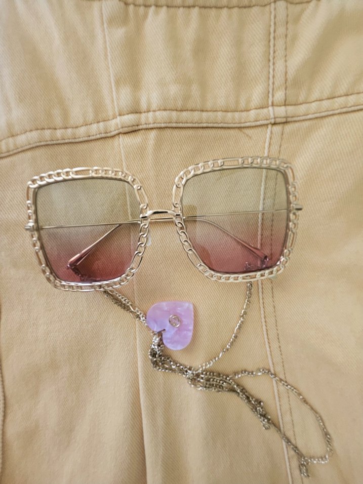 Zincir detaylı, pastel degrade renkli lenslere sahip altın renk kare vintage kadın güneş gözlüğü. Zincirde kalp şeklinde bir aksesuar bulunur.