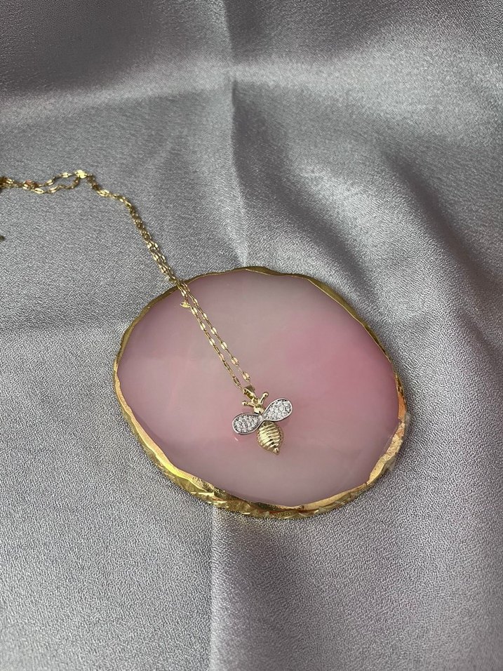 Zincir detaylı, altın renkli arı figürlü kolye. Romantik akşamlar için bohem tarzda şık bir seçim.