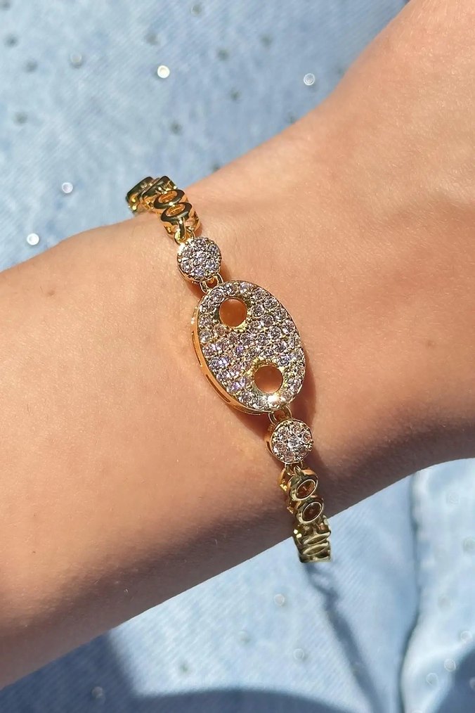 Zincir detaylı, taşlarla süslenmiş oval bir merkez parçası olan altın renkli bileklik. Günlük kullanım için uygun, ışıltılı ve şık bir tasarım. ✨