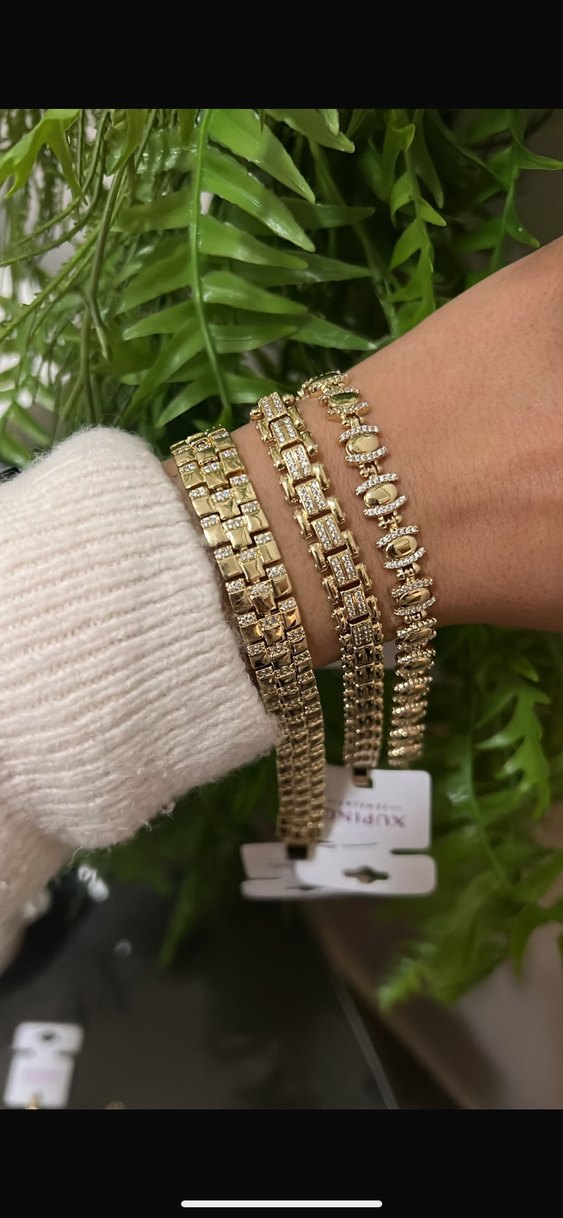 Xuping marka Zincir detaylı, parlak altın renkli ve yılan desenli bileklikler, günlük sokak tarzına ışıltılı bir dokunuş katıyor. Adet fiyatları Kararma yapmaz 14/K