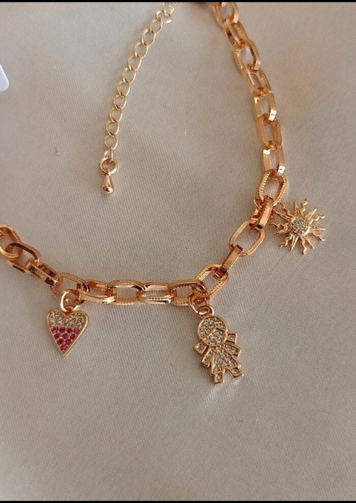 Altın renkli zincir detaylı bu bileklik kalp, güneş ve figür işlemeli charmlarla bohem tarzı tamamlar. ✨