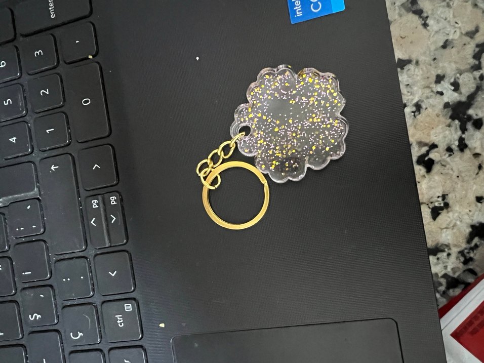 SİPARİŞ ALINIR HER HARF MEVCUT Altın renkli zincir detaylı, simli gri çiçek şeklinde kadın anahtarlığı, sade ve ışıltılı bir tasarım sunar.