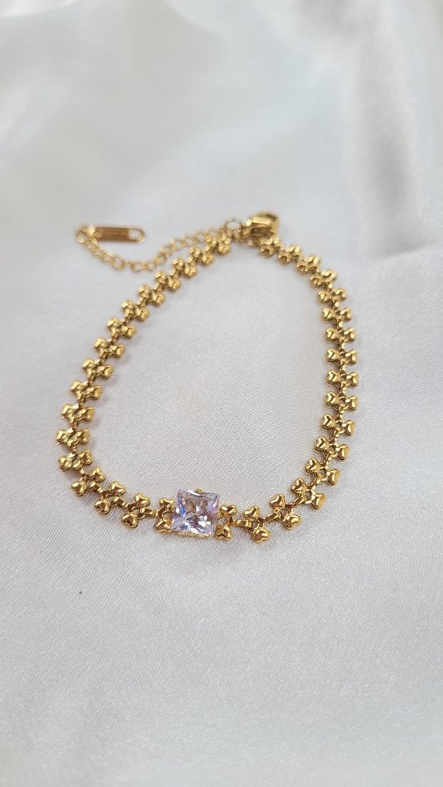 Altın rengi zincir detaylı kadın bileklik, renkli kare taş ve şık yılan derisi deseniyle modern klasik tarzı yansıtıyor. Günlük kullanım için uygundur. ✨