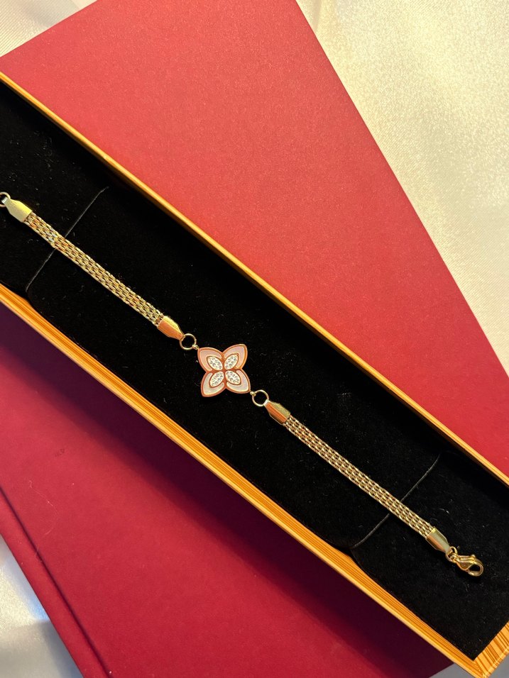 Zincir detaylı, nakışlı çiçek deseni bulunan altın renkli kadın bileklik, günlük kullanım için minimalist ve klasik zarafette.