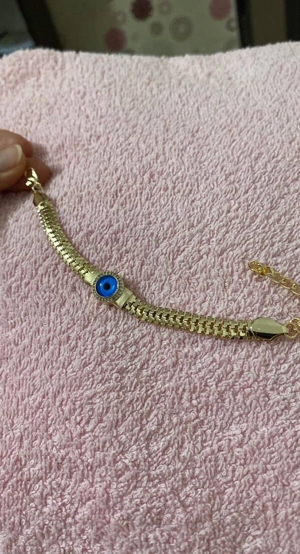 Zincir detaylı, altın renkli kadın bileklik, mavi nazar boncuğu ve parlak yılan desenli. Bohem tarzda günlük kullanım için uygundur. ✨