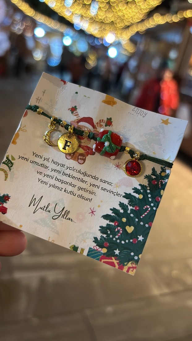 Parlak altın renkte, zincir detaylı ve baskılı figürlere sahip, bohem tarzda kadın bileklik. Yeni yıl temalı kutlama kartıyla birlikte gelir.