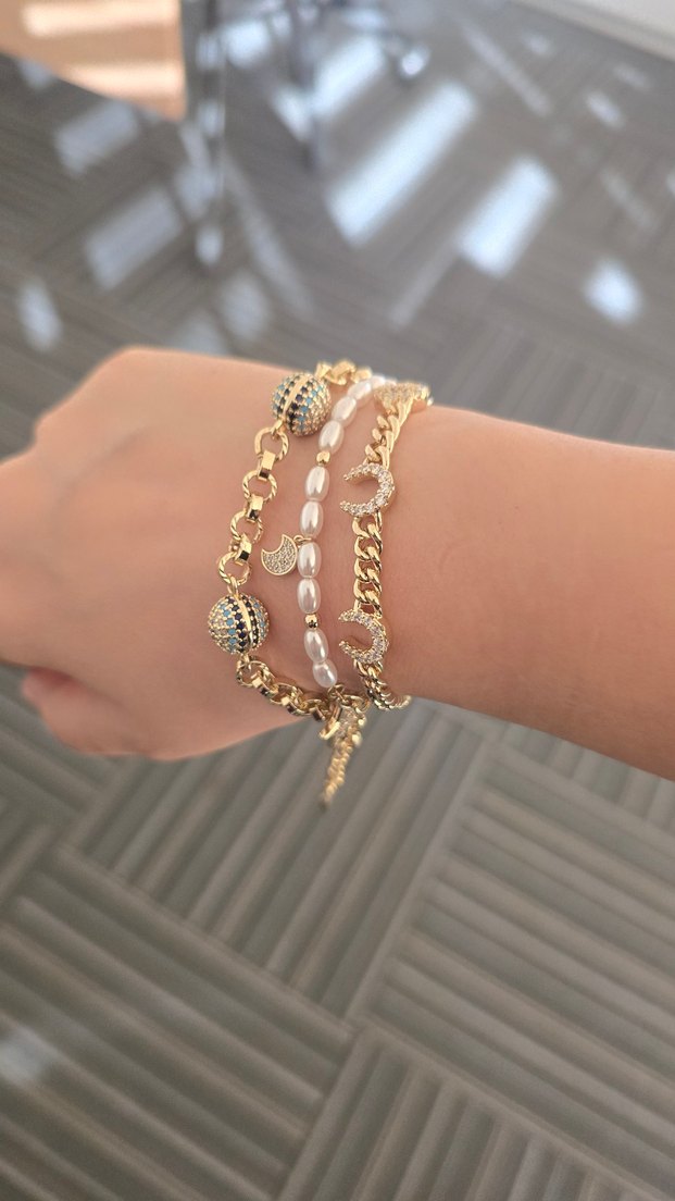 Altın renkli, zincir detaylı ve yılan desenli kadın bileklik. İnci ve aksesuarlarla süslenmiş, günlük kullanıma uygun şık tasarım. ✨