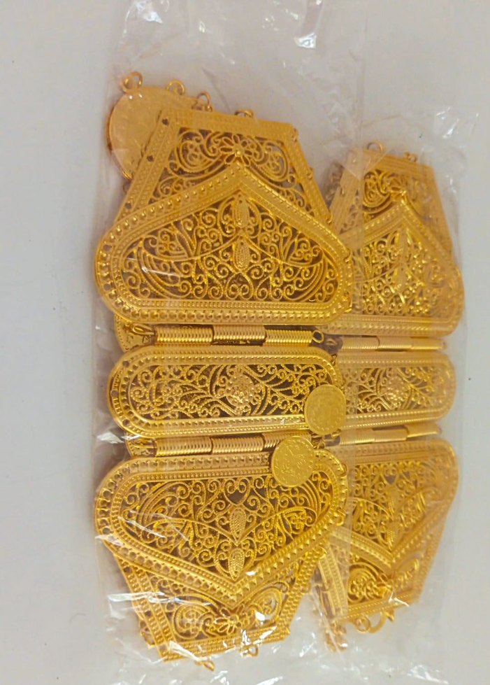 Düğünler için uygun, zincir detaylı ve desenli, parlak altın renkli kadın broş.