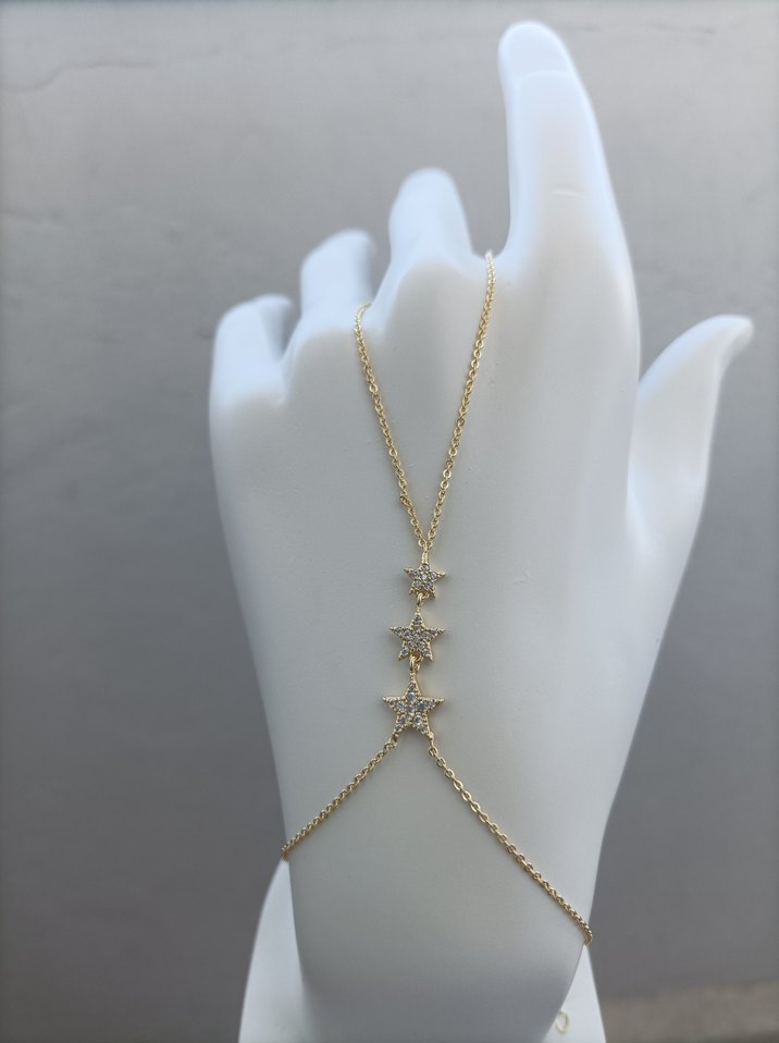Altın renginde, zincir detaylı ve yıldız figürlü bohem tarzda kadın el zinciridir. Düğünler için uygundur. ✨