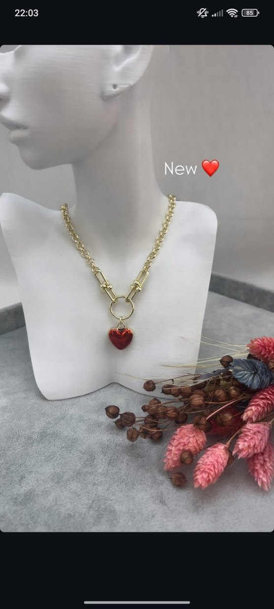 Altın renkli zincir kolye, kırmızı kalp detaylıdır. Minimalist ve çağdaş tarzda